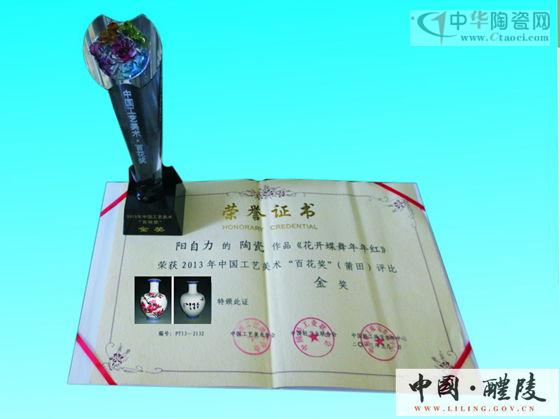 日前,2013年中国工艺美术“百花奖”评选结果在福建莆田揭晓,我市陶瓷工艺美术大师阳自力的作品《花开蝶舞年年红》喜获金奖。 中国工艺美术“百花奖”是全国工艺美术界最高级别大奖。