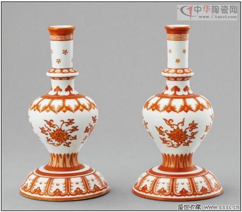 藏草瓶,亦称“甘露瓶”,为藏传佛教陈设用法器,御制甘露瓶用於在宫廷之中赏赐西藏僧侣之用,或置於佛堂之前,用於盛水或插草。藏草瓶是极具藏 族特色的器物。明朝永乐年间曾试烧製青花和颜色釉藏草瓶,传世亦见成化青花花卉纹" target="_blank">缠枝花卉纹藏草瓶。入清以後,仅见雍正、乾隆官窑烧製过红彩和斗彩品种。该瓶外 壁以矾红彩绘纹样。由上至下依次为回纹、朵梅纹、覆莲纹、仰莲纹、如意纹、变形覆莲纹、折枝莲纹、蕉叶纹、双重复莲纹。其釉汁匀净莹润,矾红鲜丽柔和,上 下映衬,光彩夺目,体现出西藏地区传统造型与内地悠久的陶瓷烧造工艺高度完美的结合。足内无款,这与《乾隆记事档》的记叙相吻合,《记事档》载:乾隆十一 年“二月奉旨烧造红花甘露瓶,俱不要款。”同年“五月初一日,唐英将按旨照样烧造得:红花白地甘露瓶四件……奉旨俱留下,其甘露瓶着唐英再烧造几件”的记 载相符。乾隆十二年“二月二十九日,大臣海望来说:太监张玉传旨:著传谕唐英将甘露瓶陆续再做些来。”该瓶秀美的造型、精细的绘工、协调的色彩与精美的纹 饰浑然一体。且成对出现,尤为珍罕。