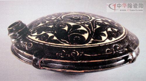 图1蒙元或金元灵武窑黑釉剔刻花扁壶 嘴口上翘,美国安思远先生藏