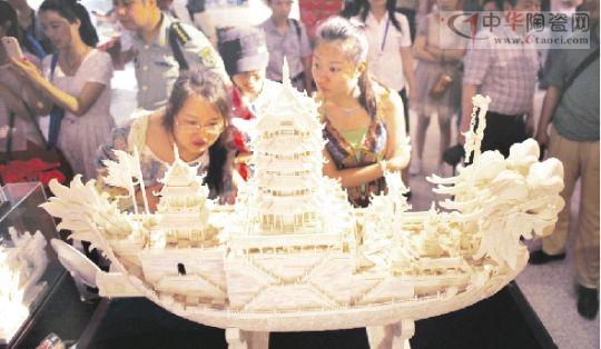 湖北展厅里,让观众最感到神奇的莫过于仙桃的贝雕。这种手工艺的原材料是淡水贝壳,主要产自仙桃的沙湖。一件长近1米的龙船通体雪白,好像会发光,表面由很多的小方格粘结而成,但船面平整、做工细腻,传承人徐银枝说,“这一台做起来要用半年,需要先把弧形的贝壳磨平,磨成各种形状,再往一起拼接”,最难的部分就是比较细小部分的雕刻,力道的掌握要很准,只见龙船上房屋的镂空花样板由数不清的小格子组成,格子小的连大点的蚂蚁都过不了。
