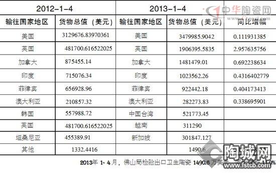 近日记者从佛山检验检疫局获悉,2013年1-4月份,佛山检验检疫局辖区的卫生陶瓷出口总额1492万美元,同比增加11.9%。一月480万,二月90多万,三月460万,四月份460万。