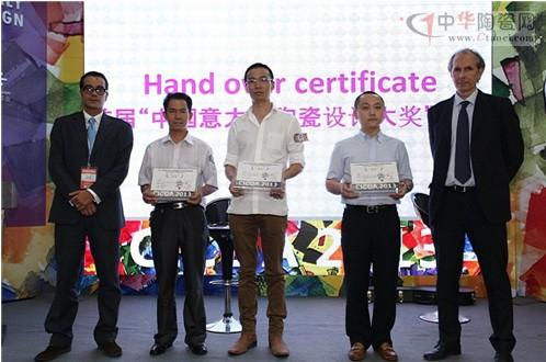 亨尼(HONEY)陶瓷設計總監沈月鋒(右三)領取首屆“中國意大利陶瓷設計大獎”銀獎