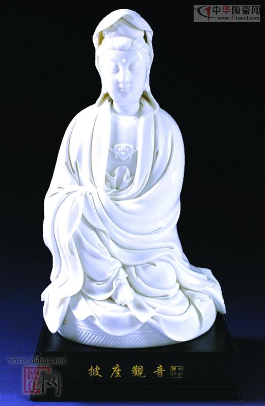 观音静坐于蒲团之上,低眉垂目,端庄慈祥的神态展现了观音菩萨大慈大悲的崇高境界。作品精雕细刻,掩手的衣纹自然飘逸,也使线条更加流畅,洁白似玉、温润剔透的瓷质衬托出观音的纯净高雅,充分展现了“东方女神”的诱人魅力。该作品(规格:16x15x28CM)曾荣获 “第五届中国(莆田)海峡工艺品博览会”金奖, 并分别被福建省艺术馆.非物质文化遗产博览苑、泉州市博物馆、德化县陶瓷博物馆永久收藏。