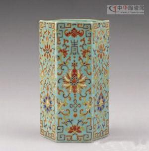 清嘉庆松石绿地粉彩描金福寿六方笔筒在2008年匡时春拍中,仅拍出45.92万元。