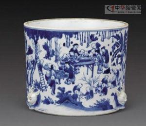 虽然瓷质笔筒的制作在明末已呈规模,但传世品绝大多数珍藏在各大博物馆中,上拍品相对较少,成交价上也逊色于清三代制品。 在中拍国际2011年元明清瓷珍雅玩拍卖会上,明崇祯青花高士图笔筒以高出估价近两倍的299万元成交,此笔筒呈直筒形,平底,三条形矮足。筒身青花通景绘高士图,松下两人,一人倚石而眠,一人正在搔痒,另两人站于松后讲经论道,还有一人坐于溪边,远眺群山。人物绘画精细,神态描写逼真,笔触纤细,青花发色明艳,堪称崇祯时期青花瓷器的精品力作。当时纹饰题材刻意迎合社会风尚的需求。其中以人物类的题材最具特色,体现出高超的制瓷水平与鲜明的文人意趣。对此,晚清寂园叟于《雅》卷上有评:“明瓷青花人物,以笔筒花觚为甚诙诡”、“明瓷青花笔筒,往往凹雕一围填以影青。画笔工给无款识,瓶觚亦然”。在2007年中贸圣佳夏季艺术品拍卖会上,明崇祯青花百子图笔筒以212.8万元成交,此件笔筒呈色艳丽而沉着,构图错落有致,人物众多,场景、山石、树木以及孩童衣着款式、颜色、游戏的内容多变,轮廓线条清晰,笔筒外壁下部塑有三个兽面,形式新颖,极为少见,且保存完整,实为难得。