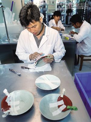 6月5日,海南省博物馆出水文物保护修复实验室内,科研人员在修复华光礁出水的瓷碗。