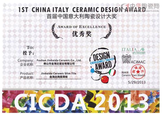2013年5月29日,在佛山新媒体产业园首届“中国意大利陶瓷设计大赛”颁奖礼现场,金海达薄板凭借“北欧枫情”系列产品作为薄板界唯一代表荣获设计大奖。此次奖项的评比,完全严格参照意大利的相关标准,对参选公司的技术水平、设计实力进行客观公正严谨地考评,旨在选出设计概念与产品品质最杰出的中国瓷砖产品。