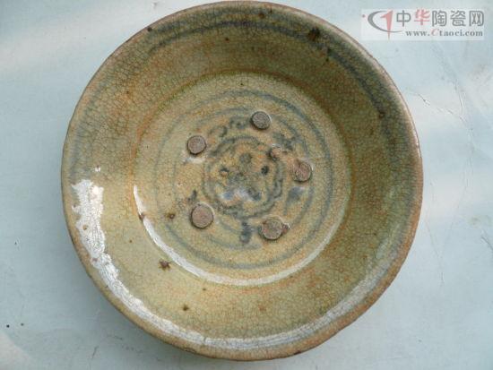 石厂窑青瓷胎土有白、灰白、灰黄等,均使用一种本地叫“观音土”的瓷土,只是陶洗的精细程度不同而已。石厂瓷釉色有青黄、青灰、青绿数种,另有少量黑瓷。器型以碗为大宗,另有各型折腰盘、高足杯、茶臼等。青瓷釉色又有两种,一种颜色偏绿,呈玻璃光泽,与中原青瓷相比毫不逊色,另一种颜色偏灰,亚光(图1、2、3)。青瓷以素面为主,但部分碗底有印花装饰。石厂窑使用龙窑烧制,慢轮手工拉坯,碗盘之间使用泥丸支烧,青瓷、黑瓷同窑烧制。
