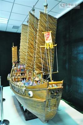 在民间艺术新作展上,根据史料复原的“郑和宝船下西洋场景”尤为吸引眼球。该宝船根据香港海事局提供的《天妃经》图卷按照10:1比例进行创作,长约3米,高约3米,历时四个半月才完成,并依据明代祝允明《前闻记下西洋》的记载,设有旗军、火炮手、舵工、医士、太监、民艄等,同时内部还配有航海时的音响,结构精巧复杂,场景惟妙惟肖,引来现场观众阵阵赞叹声。另一件艺术新作“童趣”核雕个头虽然“迷你”,但却在方寸间活灵活现地展现出三个小朋友放风筝的生动场景,人物刻画栩栩如生,尤其是风筝线更是细如发丝,令人拍案叫绝。刚刚获得中国人口文化奖的苏绣《椅中圣母》昨天也亮相现场,让市民领略了苏绣的艺术魅力。