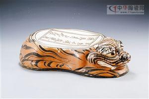 阎焰颇喜欢山西陶瓷中的老虎枕,馆藏的多个虎枕像一头头老虎匍匐在地,或张口怒目或憨态可掬。最妙的是一件赭地黑彩诗文虎枕,枕面还有两句诗,“闲吟古调敲龙角,醉卧青山枕虎腰”,何等豪迈大气,“陶瓷虎枕是流行于金代的一种很有特色的生活用具,老虎成了守候人间美梦的枕上神灵。”
