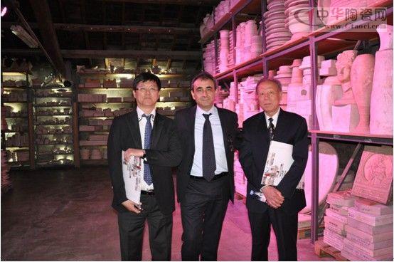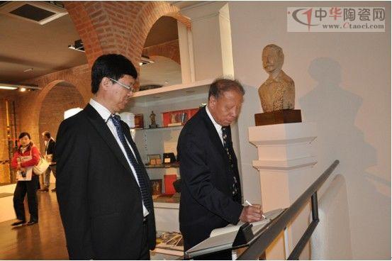 伊莫拉陶瓷集团主席斯蒂法诺?波罗涅思(中)带领意大利蜜蜂瓷砖中国区总裁张有利(左)、中国建筑装饰协会会长李秉仁(右)参观伊莫拉陶瓷博物馆