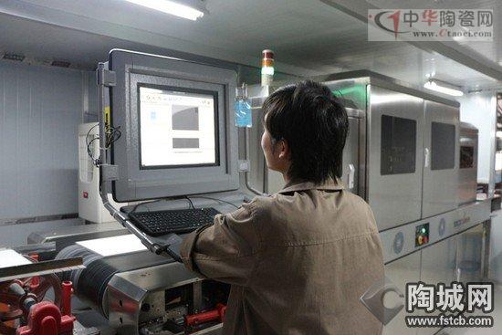 内墙砖企业生产工人正在操作间内观察喷墨印花机工作状态