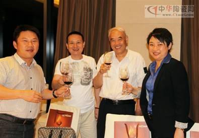 鹰牌陶瓷副总裁陈贤伟(左一)、建材周刊董事长罗青(左二)、佛山市陶瓷行业协会副会长黄希然(左三、)与陶瓷总部副总经理汤洁明(左四)共同举杯祝酒