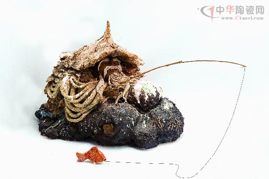 眼前这尊老翁,饱满有形,神态可掬。尖顶的竹笠上覆盖着皑皑白雪,厚重而柔软地覆在老翁头上,使原本就已十分娇小的身体仅能露出那胖嘟嘟的脸蛋,让人忍俊不禁。老翁的上半身微微前倾,悠然自得地盘坐在黑漆漆的岸边顽石之上,令人不禁担心,那身单薄的蓑衣和飘逸的麻衫能不能为他驱走可怕的冰寒。不过一看那精神抖擞的长眉白须,就能知道这只不过是旁人的多虑而已。手拈幼竿的蓑笠翁,“独钓寒江雪”却依然钓趣盎然。闭目养神之际,一尾红鲤已入囊中,真真儿有姜太公钓鱼的范儿!
