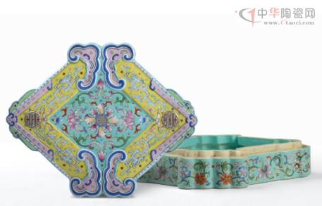 乾隆时期御窑瓷艺精进,集历代名窑良器之精萃,借以御窑厂之能工巧匠,勇于创新。此件粉彩花卉纹如意菱形盖盒,作品尊贵秀雅,装饰雍容华丽,隽逸秀美,彩绘装饰颇具特色。通体以翠绿彩为地,盖面四柄如意两两相交组成菱形。如意施以黄彩,其上绘夔龙纹及团寿纹,盖心及盖盒沿面绘以各式绽放洋花,枝蔓舒卷自如,设色淡雅清新,尽现乾隆彩瓷之尊贵雍容。整器绘画精细入微,气韵婉约雅致并流露出西洋之气息,于清新中复见华贵,温和并蕴含富丽。