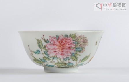 花事是古代文人雅士重要的怡情活动之一,对各式花材的品评、选择均有严格的标准,雍正皇帝对此非常精通,讲究组合之美,追求自然清新之唯美境界。因此雍正一朝宫廷诸项工艺品中,凡有花卉题材者,均是工笔写真,形神俱佳,气韵清雅脱俗。特别是雍正时期的粉彩瓷器清雅怡人,历来为藏家所珍视,正如《陶雅》中所说:“粉彩以雍正朝为最美,前无古人,后无来者,鲜妍夺目,工致殊常”。拍品清.雍正粉彩牡丹纹碗,胎薄体轻,釉面似玉般温润细腻,更能突出线条纤细、色彩柔和的纹饰之美。拍品造型隽秀端庄,外壁粉彩绘牡丹、芍药、菊花等簇拥而生,花枝横向延伸,叶片宽大,牡丹丰硕红艳,芍药饱满淡雅,蜜蜂飞舞其间,一派欣欣向荣之景象。画笔清秀细腻,设色淡雅逸丽,仿若春风拂面,醉人心扉。