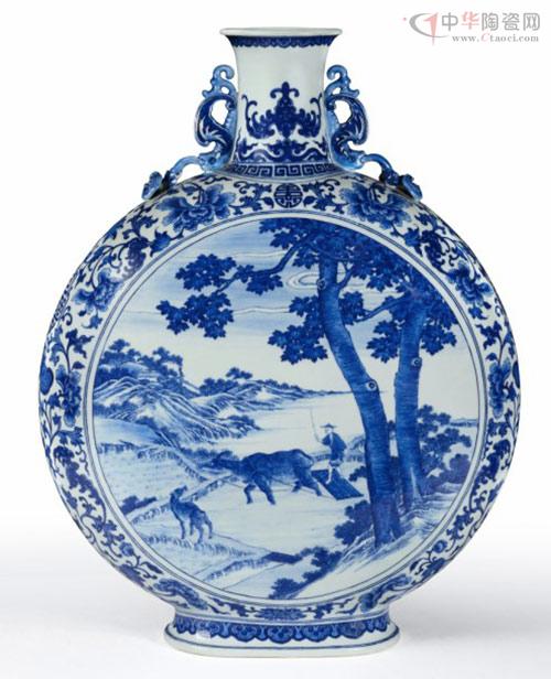 此专场重中之重为一件清.乾隆年制青花春耕图双福如意耳特大抱月瓶,这件重器造型硕大,高达59公分,胎釉细润,精巧端庄。颈两侧置对称夔龙耳,玲珑别致。瓶身扁平,形若满月。全器以青花绘就,口沿外部绘如意云头纹一周,颈部则绘蝙蝠作饰。腹部两面开光,一面绘春耕图之“耕”,图中农夫赶牛犁地;另一面则绘“耙耨”,农夫站立木耙上以牛拖行,以打碎泥块。两面背景相同,皆是双桐树下,阡陌相交,不远处农舍隐现,所绘人物面目表情及衣褶生动。其余边饰为青花绘团寿缠枝花卉纹,发色鲜艳翠亮,运笔流畅,繁而不乱,与莹白滋润的釉面相互映衬,别有一番韵味。