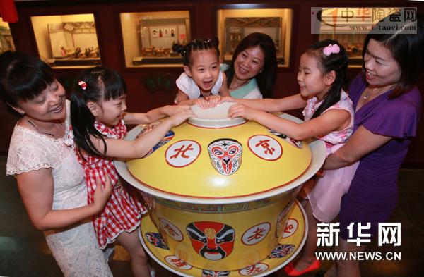 6月30日,家长带着孩子在北京老舍茶馆参观巨型盖碗。