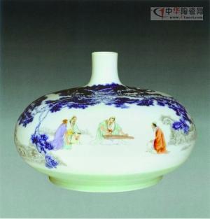 王怀俊绘青花斗彩瓶《松下抚琴图》