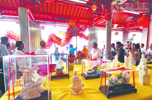 走进祖龙宫, 只见县里从事陶瓷业的陶艺家和企业家已早早来到殿前,他们带着各式的陶瓷产品前来供奉,有新开发并获得订单的产品,有传统瓷雕,瓷艺新作,还有西洋工艺和日用陶瓷。与人们常见的猪、牛、羊等“三牲”祭礼不同,这种用陶瓷当供品的祭祀文化在世界陶瓷史上独一无二,吸引了各路媒体的聚焦。“大家都把烧得最好的陶瓷拿来供奉,表示敬意,这里面体现的更多的是精神层面的东西,是对文化的传承。”中国陶瓷艺术大师苏献忠介绍道。
