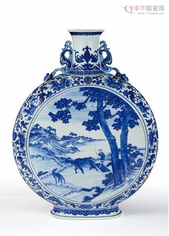 清乾隆 青花春耕图双福如意耳特大抱月瓶 高:59公分