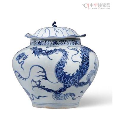 元代是中国陶瓷史上的一个重要时期,本场拍品中的“青花龙纹盖罐”,器形沉稳,线条刚劲。所施白釉白中泛青,晶莹透亮,青花发色浓艳,铁斑凝聚,深入胎骨。所绘龙纹风格与英国大维德艺术基金会所藏元至正十一年青花大瓶上的龙纹画法、神态一致,此类传世元青花大罐荷叶盖多已遗失,而作品保存完好,更显难得珍贵。