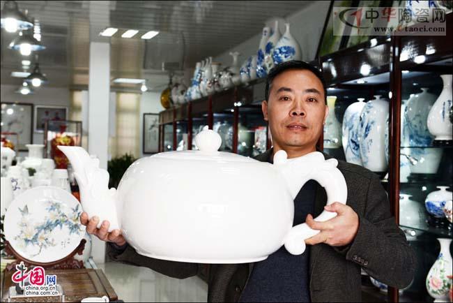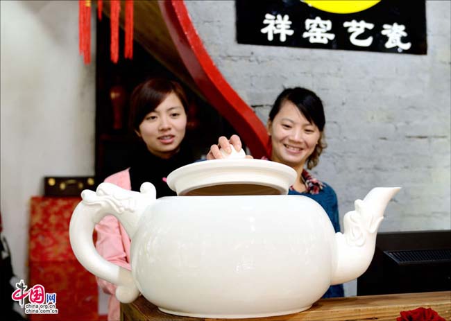 中国网12月9日讯 近日,记者在瓷都福建德化陶瓷街祥窑艺瓷展馆目睹了由泉州市工艺美术大师陈清宜制作的“白瓷第一壶”中华壶的风姿。这把刚刚诞生的巨大白瓷壶成为刚在陶瓷街开业的祥窑艺瓷展馆的“镇馆之宝”。