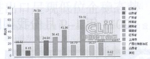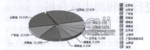 2013年1-9月陶瓷行业完成利润总额前四位的地区一次是江西、山东、广东、河南,其中江西累计完成利润总额同比增长18.32%,占27.81%;山东累计同比增长8.13%,占21.01%。详见图4.