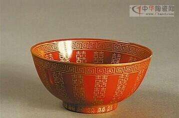 清同治“燕喜同和”款红地金喜字碗