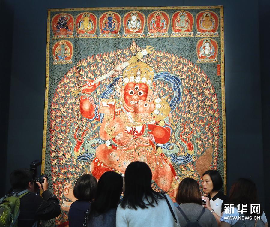 11月21日,香港佳士得专家在重要中国瓷器及工艺精品2014年秋拍预展上介绍焦点拍品明永乐御制红阎摩敌刺绣唐卡,估价逾8000万港元。