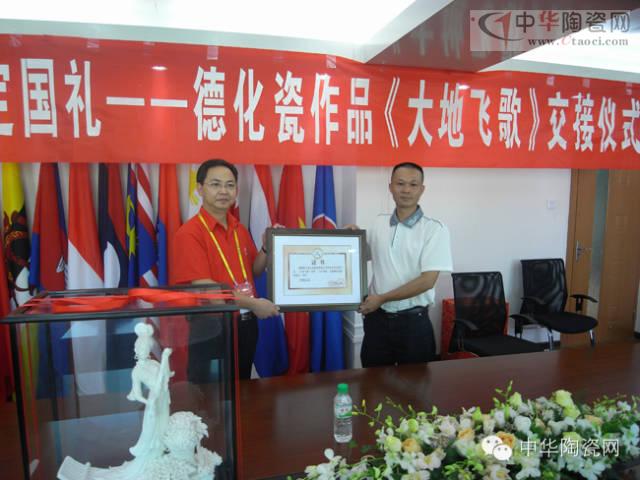 《大地飞歌》成为“2008年中国—东盟博览会指定国礼”,赠送给东盟各国国家领导人,并载入东盟史册;2010年泉州霞洲妈祖宫赴台湾台南大天后宫祭奠之时,德化瓷塑作品《大地飞歌》被作为礼品赠送给国民党主席马英九。