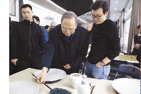 大陸前國務院副總理曾培炎(中)訪台華窯,在瓷盤上題字留念。(台華窯提供)