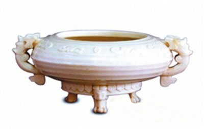 这件白釉瓷双螭耳三足炉其造型与纹饰虽模仿商周青铜双螭耳簋式三足炉形制,但形体轩昂,给人以稳重匀称、器型规整、线条柔和之美感。与古朴的铜双螭耳簋式三足炉相比,另有一番典雅秀丽的韵味,具有异曲同工之精妙,使人观之爱不释手。白釉瓷双螭耳簋式三足炉通体施乳白釉,于细腻洁白色中微微泛黄,瓷簋式炉外底露胎,胎洁白细腻,整件器物其装饰在莹润的釉色中似隐似现,既简洁生动,又古朴典雅,给人以温润宁静庄重的美感享受。由此可以看出:这件明代德化窑白瓷双螭耳簋式三足炉,其瓷、胎、釉乃至装饰艺术等都达到了很高的艺术境界,是一件难得的上乘艺术精品。
