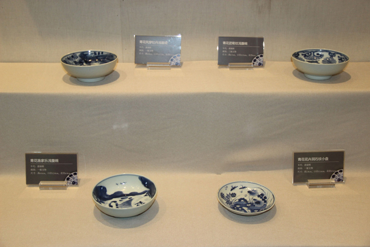 此次展出的一百件瓷品为“碗礁一号”出水瓷器中保存最完好、图纹最精美的作品,其中以青花瓷居多,这些青花瓷均为康熙年间青花瓷鼎盛时期产品。工作人员告诉记者,不同于以往外销瓷具有的异域风情,“碗礁一号”出水瓷器的中原文化更加鲜明。从沉船中打捞出来的瓷品主要以中国传统山水人物图案为主,如青花折枝牡丹盘、青花渔家乐浅腹碗、五彩博古纹盘等。