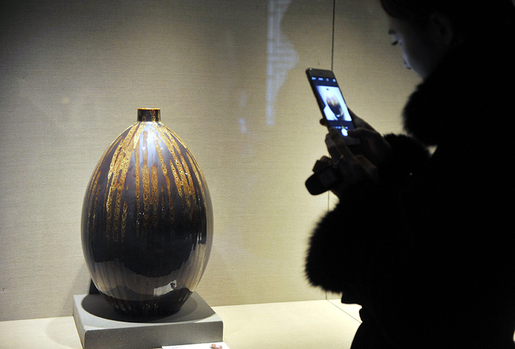 2015年1月30日,一名女子在北京恭王府拍摄展出的陶瓷作品“丹朱呈祥”。新华社记者 宋为伟 摄