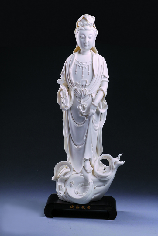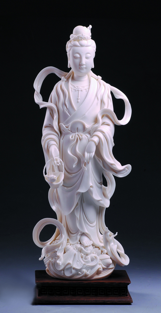 作品《鱼篮观音》便深具林吉祥自己的标签。观音赤足站立荷叶之上,下承水浪激涌,胸饰珠串,着通肩衣袍,右手提篮,左手持裙,垂目肃静安详。这件作品最引人注目的除了观音面部的恬静安详、气韵生动以外,还有其周身环绕的长飘带。这些长飘带不但烧制困难,更能充分发挥出线条对人物造型的重要作用,“以线刻体、以体托线、线体结合”,烘托出人物的精神气质和内在性格,表现出一种细腻、纤巧的形式美。