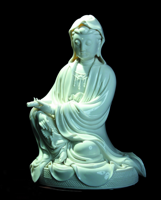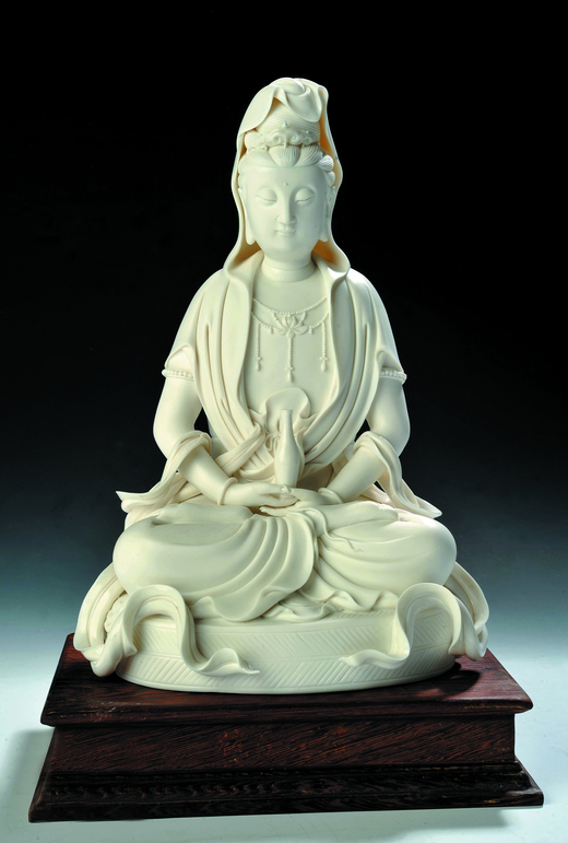 之后,他又拜德化许氏瓷塑第六代传人许瑞峰为师,专习观音塑像。蕴玉瓷庄和许氏瓷塑是德化瓷坛中举足并重的两大陶瓷世家,林吉祥却对这两大风格进行了综合的学习,他既深受苏献忠奔放飘逸思想的影响又继承了许瑞峰精雕细刻的特点,兼收并蓄,力求在二者之间找到平衡点,形成自己的特征。