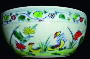 青花斗彩是以釉下青花作为一种色青而与釉上多种色彩相结合的瓷器装饰技法。“斗”是景德镇方言,意思是几种东西合并组合在一起。斗彩就是把几种色彩组合在一起的技法。斗彩是一种釉上、釉下都有彩的彩色瓷。这个青花斗彩鸭子瓷碗,高7.5厘米,口径17.5厘米,底径10厘米。外壁青花斗彩绘有鸭子戏水图,红花绿叶,分外妖娆。两只彩鸭,在水中欢快地追逐嬉戏,尽情享受春天惬意的生活,在花卉和水草的衬托下,呈现出一派悠闲自得的春日美妙图景。