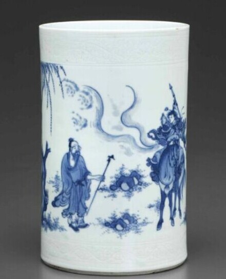 笔筒直腹,口和足的外沿暗刻纹饰,器身通景绘青花人物故事图。一人骑马驰至,与持拐老者交谈。青花浓淡有致,色泽明快,绘画细腻,人物刻画生动、布局合理,胎质细腻。应为一件不可多得之文房佳品。在翰墨飘香的中国传统文化中,除了笔、墨、纸、砚文房“四宝”之外,还包括了很多的辅助文具,笔筒就是其中的一种。从明代起,制作精致的笔筒就成为文人雅士和收藏家的宠物。
