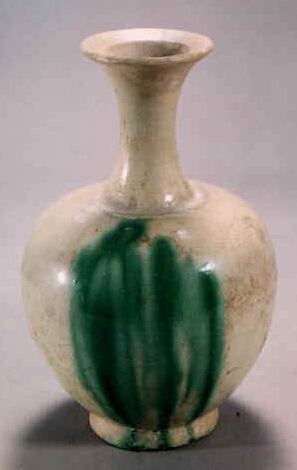 北齐,高22厘米,口径6.8厘米。1971年出土于河南省安阳市北齐武平六年(575年)范淬墓出土,现藏河南省博物院。器饰白釉,白釉泛青。腹部有翠绿斑驳,色彩鲜明。在中国陶瓷发展史上,早期的瓷器均属于青瓷系统,白瓷的生产要晚于青瓷,白瓷生产的条件比青瓷更为严格,必须降低胎、釉料中的铁的含量。白瓷的出现,标志着制瓷工艺的巨大进步,它打破了青瓷一统天下的局面,为以后彩瓷的发展奠定了基础。
