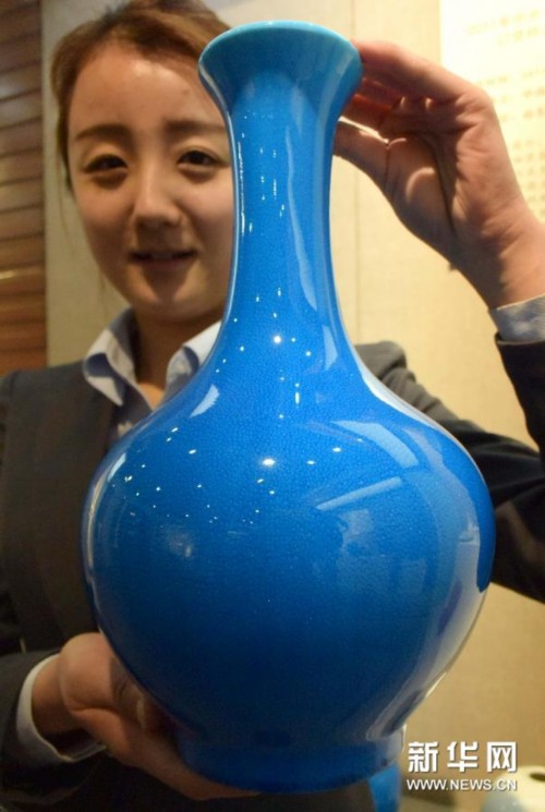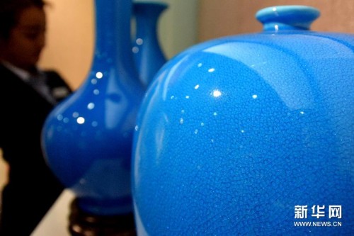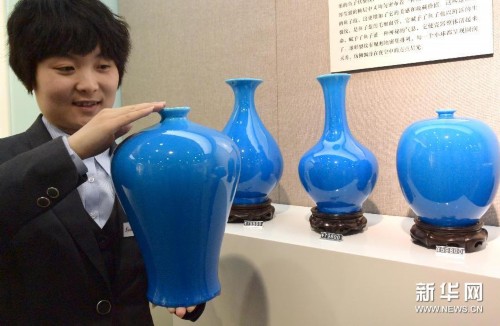 3月23日,工作人员在展示“鱼子蓝”釉瓷器。