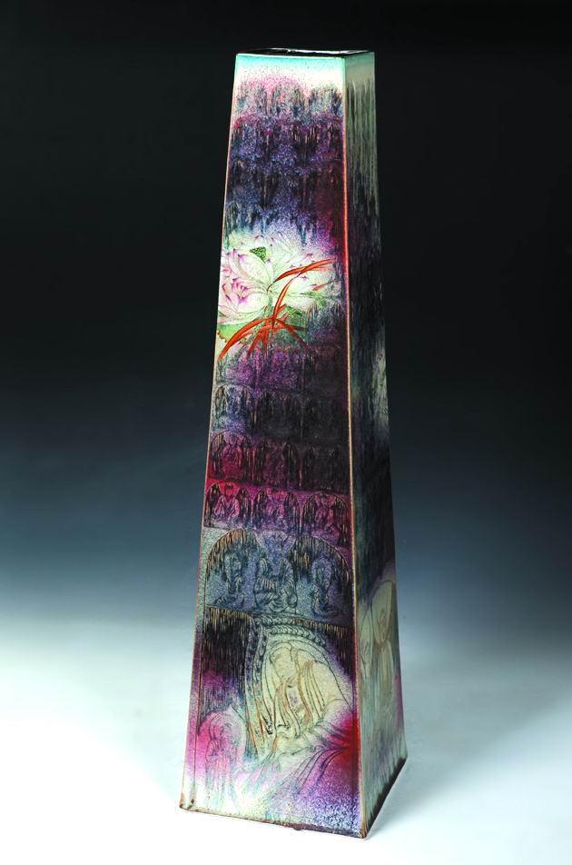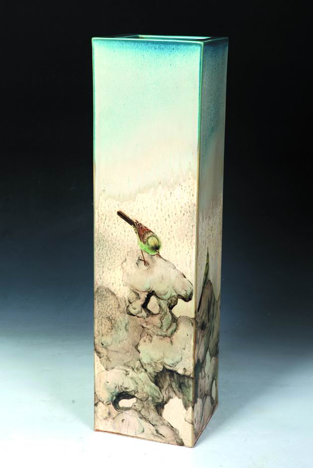 带着一份景德镇人对陶瓷艺术天然的灵性,凭着介乎抽象与具象之间的表现手法,利用色釉的色彩以及陶瓷的材质,从美术角度出发,李川终于悟出了自己的陶瓷语言——“做陶瓷”。有别于传统意义上的“画陶瓷”,李川所要表达的“做陶瓷”,不仅仅偏重于绘画的表现,而更是要将多种激发融入其中,在创作时融入兼工带写的创作技法,结合釉上绘画、釉下刻划,经过两次或更多次的烧制,使颜色釉的色彩更为多变。李川的创意佳作,亚光状态的表面呈现出瑰丽却不张扬的风格,而以山水或花鸟作为主题的作品,含蓄中却又相当出众,夺人眼球。