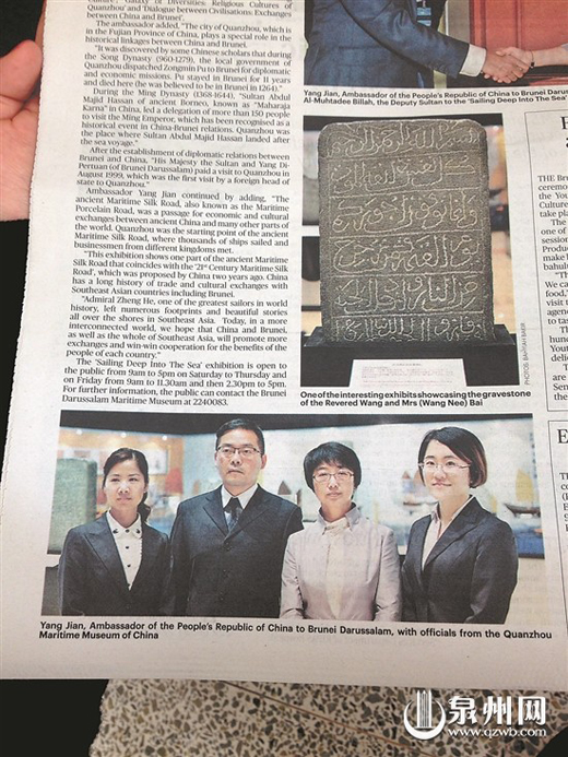 23日在文莱首都斯里巴加湾开展的“碧海丝路东方之舟——泉州‘海上丝绸之路’展览”,在当地引起轰动,吸引了文莱王储、内阁大臣、各国驻文使节等重要嘉宾的出席。