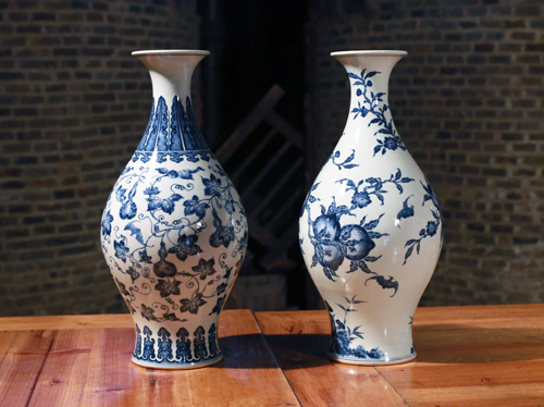 复烧成功的清代雍正青花桃蝠纹橄榄瓶(右)、清代雍正青花缠枝葫芦飞蝠纹橄榄瓶(左)。(记者王东 摄)