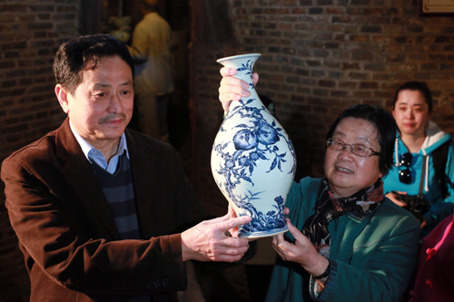 故宫博物院古陶瓷专家叶佩兰(右)和文物研究员周荣林展示复烧成功的清代雍正青花桃蝠纹橄榄瓶。(记者王东 摄)