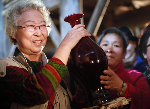 来自辽宁鞍山的游客杜金兰女士高兴地举起刚出窑的瓷器拍照留念。(记者王东 摄)