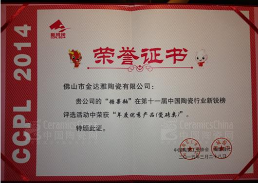 2015年3月28日,第十一届中国陶瓷行业新锐榜颁奖典礼暨中国制造•佛山论坛在佛山新媒体产业园隆重举行。金达雅陶瓷原创糖果釉瓷砖凭其全新技术,闪亮肌理喜获“年度优秀产品(瓷砖类)”大奖,成为中国陶瓷行业2015年陶瓷新品中亮眼之星。