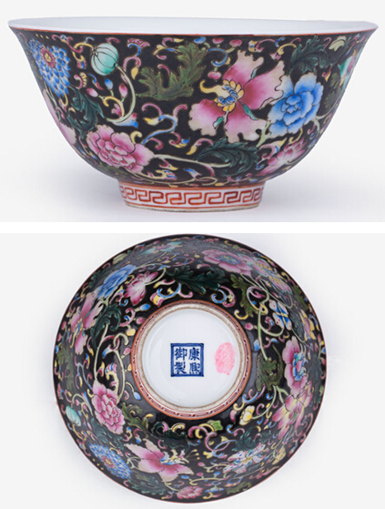 此藏品口沿微外撇,直壁,圈足,以乌金釉为地,其上又以粉彩绘画“花卉”图案,充分展现出康熙时期宫廷繁丽富贵之特色,此件粉彩作品即为康熙时期国力昌盛时所烧制,是颇受帝王喜爱的御窑宫廷陈设赏器,整体画工精美,纯净莹润的墨彩和粉彩花卉的搭配相映成辉。施彩瑰丽浓艳,纹饰繁缛,尽显清代宫廷华丽之风,底足内有青花楷书“康熙年制”四字双行款,堪称康熙御瓷,保持完整,实属少见之重器极为难得,相类似的作品在各大馆藏及拍卖中罕见,极具收藏和投资价值。