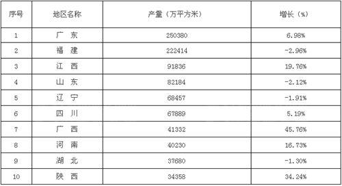 最新数据显示,2014年全国各省市建筑卫生陶瓷产量共计1022954万平方米,同比增长5.57%。其中,广东产区仍居首位,陶瓷砖年产量250380万平方米,同比增长6.98%;福建产区以年产量222414万平方米居第二,同比下降2.96%;江西产区则跃居第三,年产量91836万平方米,同比增长19.76%;山东紧随其后,以82184万平方米的产量位居第四名,同比下降2.12%;辽宁则以年产量68457万平方米暂居第五,同比下降1.91%。