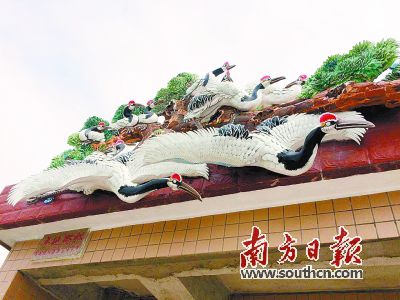 饶平县黄冈镇寨上社区,一片水泥房住宅中,有一间民宅屋顶显得“鹤立鸡群”—屋顶真有88只瓷“鹤”栖息在瓷做的松树上,这幅图是屋主蔡炳烈用3000个瓷